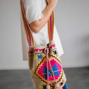 Jede Colorita ist ein handgefertigtes Unikat, welches individuell von einer Frau der Wayuu kreiert wird. Daher können die Maße und das Design je Tasche leicht abweichen. Neben dem Boden wählt die Weberin selbst die Technik und das Muster des Trageriemens und des Tunnelzugs aus